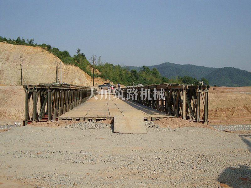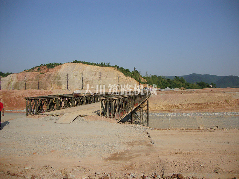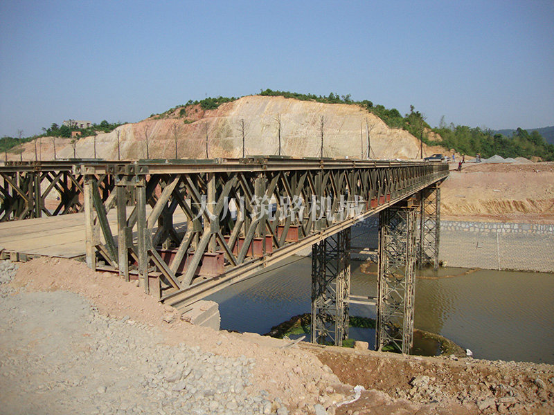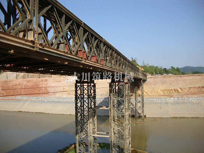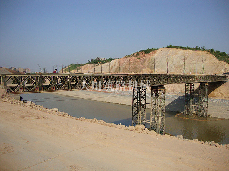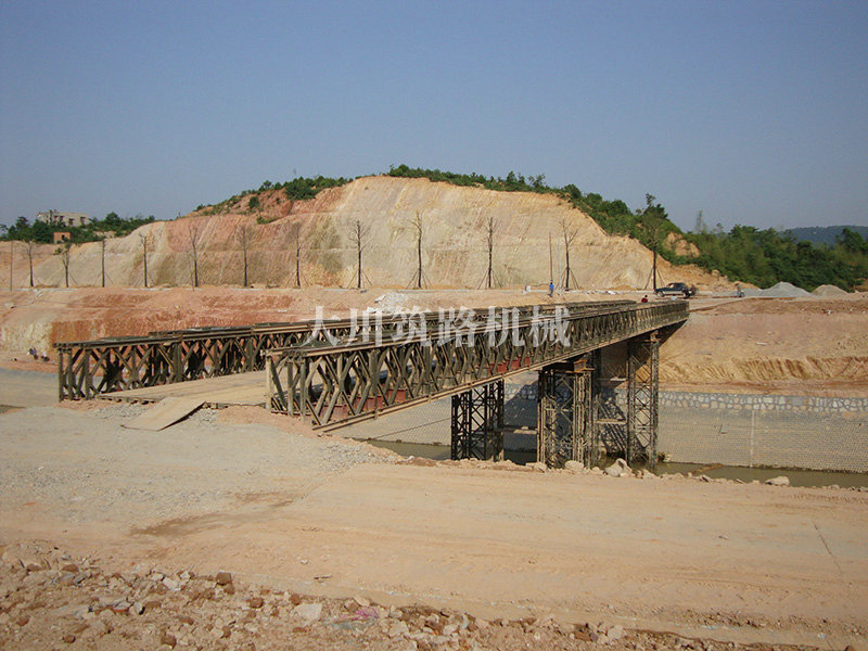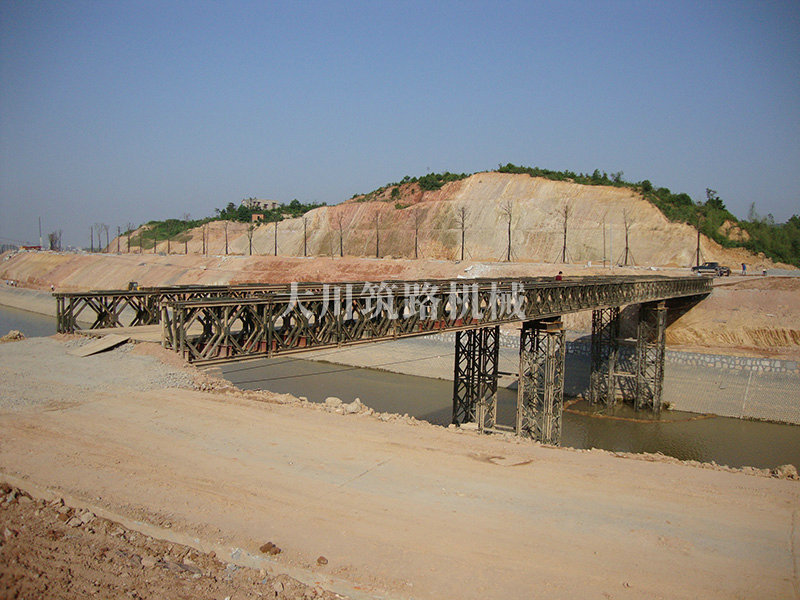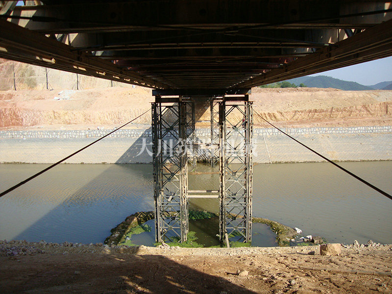 特點:本鋼橋由國防科技大學全程指導和監督安裝,滿足荷載80T施工車輛通行,因施工場地要求,采用貝雷梁組合式橋墩,安裝拆除方便,穩定性好。采用推出法安裝,安裝周期20天,于2011年5月25日通車。